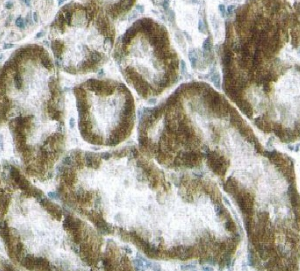 HE染色是先用苏木精染液将切片组织过染,经水洗后再用盐酸酒精分化,弱碱性水溶液返蓝。使胞核呈鲜明的蓝色,胞质及背景无色,再水洗后用伊红染胞质。HE染色的关键在于深浅适度,对比鲜明,一般有经验的,肉眼就能判断,但偶而也会出现失误,所以用显微镜控制是最保险的方法。其关键的步骤在于苏木素染好后的分化及蓝化过程,在蓝化结束后,应在显微镜下观察细胞核着色是否合适,核结构是否清晰,胞浆内是否有残留的苏木素等等。染色理想的切片在显微镜下应是:细胞核与细胞浆应蓝红相映,鲜艳美丽;核浆对比明显,核膜及核染色质颗粒清晰可见。